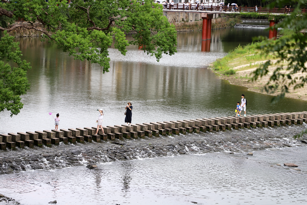 北涧桥前平整条石砌成的碇步,人们在其上游玩拍照。新华社记者 张晓洁 摄