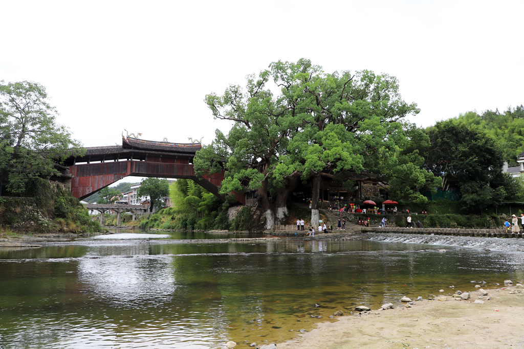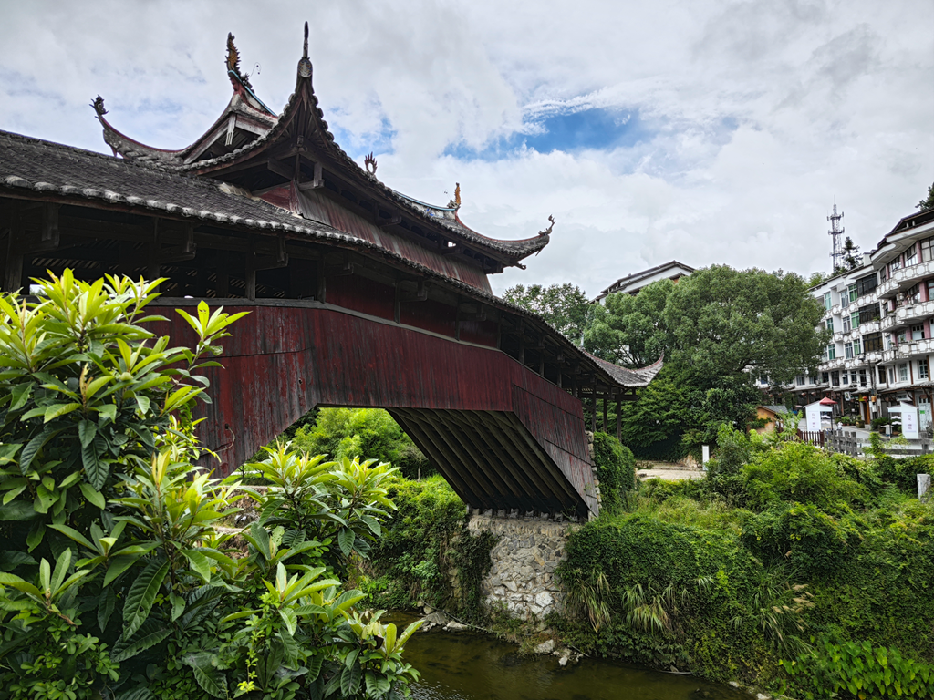 镇中心不远处,东溪水面约10米之上横跨—座当地传统的木拱廊桥——溪东桥。驻足观望,廊屋檐翼角飞挑,脊兽龙背弓起,桥身斑驳的红漆仿佛诉说着450多年的沧桑,成为这里远近闻名的景观。