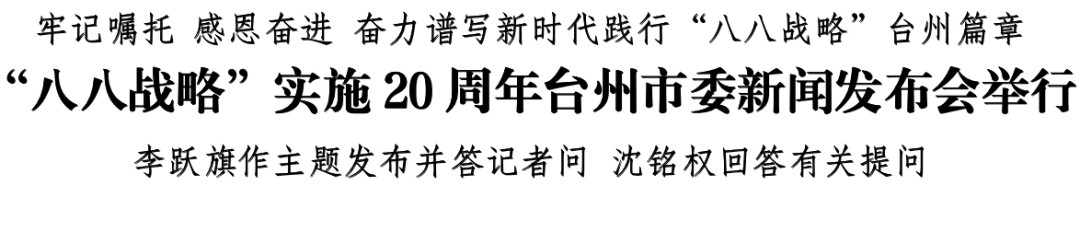 8月10日上午,“八八战略”实施20周年台州市委新闻发布会举行,主题为“牢记嘱托 感恩奋进 奋力谱写新时代践行‘八八战略’台州篇章”。