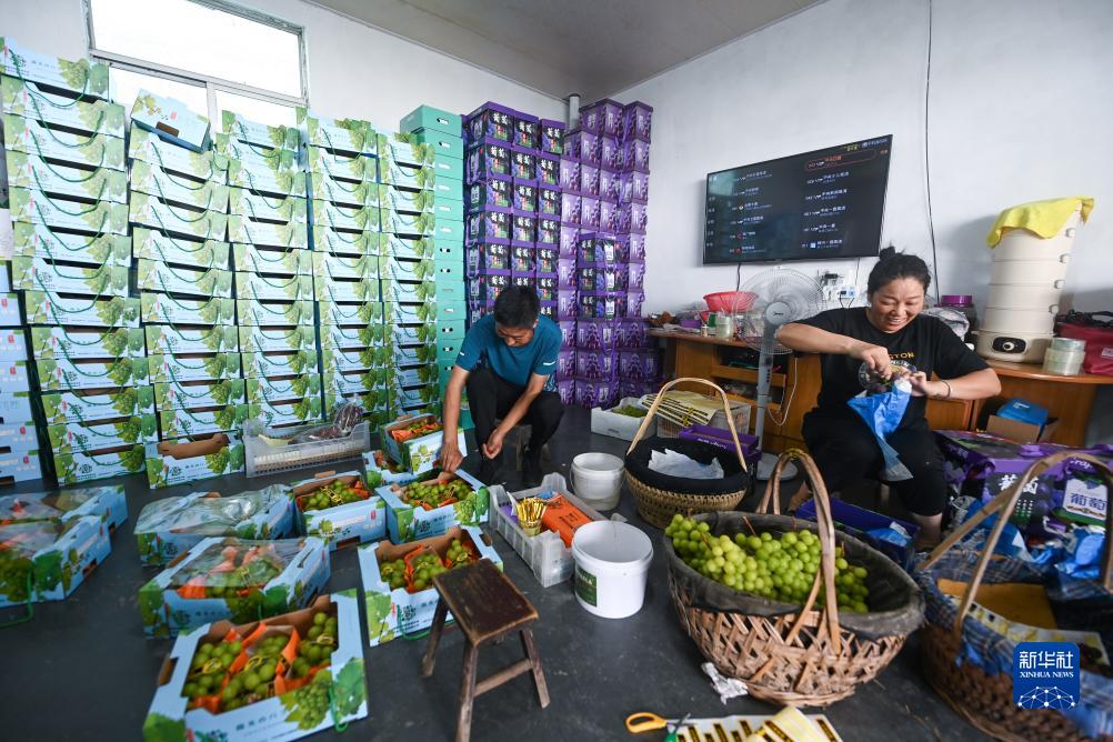 8月20日,在诸暨市姚江镇紫草坞村阿群家庭农场内,种植户打包成熟的葡萄,准备运往市场。