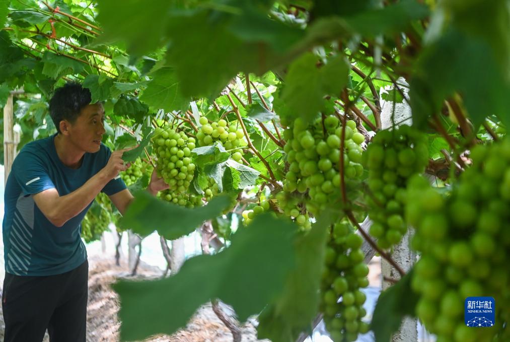 8月20日,在诸暨市姚江镇紫草坞村阿群家庭农场的葡萄大棚内,种植户寿怒涛查看葡萄的成熟度。寿怒涛通过农技培训学习葡萄种植新技术,提高葡萄的口感和产量。