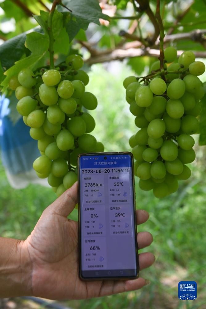 8月20日,在诸暨市姚江镇浦西村纯禾生态园内,种植户何建华展示手机上实时显示的葡萄园各类环境信息。