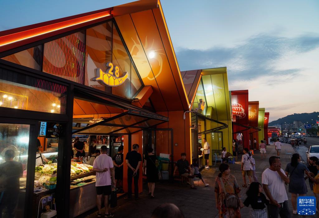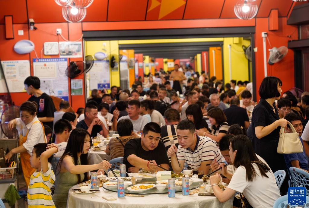 8月16日,市民和游客在浙江省舟山市沈家门海鲜夜排档内就餐。新华社记者 韩传号 摄