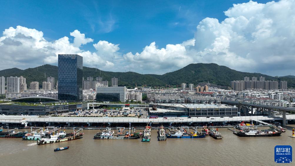 渔运船将新鲜梭子蟹运到浙江省舟山市普陀区舟山国际水产城码头(8月16日摄,无人机照片)。新华社发(胡锦 摄)
