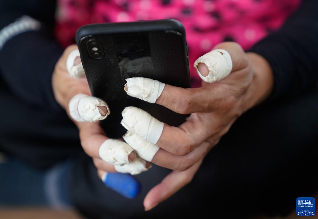 8月17日,一名来自安徽阜阳的务工人员在分拣梭子蟹后休息,她在手指上缠满胶布防止被蟹钳夹伤。新华社记者 韩传号 摄