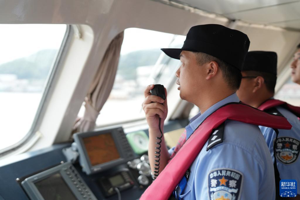 8月17日,浙江省舟山市公安局普陀区分局民警联合边检部门在沈家门港区开展日常巡逻工作,引导渔船有序进出港。新华社记者 翁忻旸 摄
