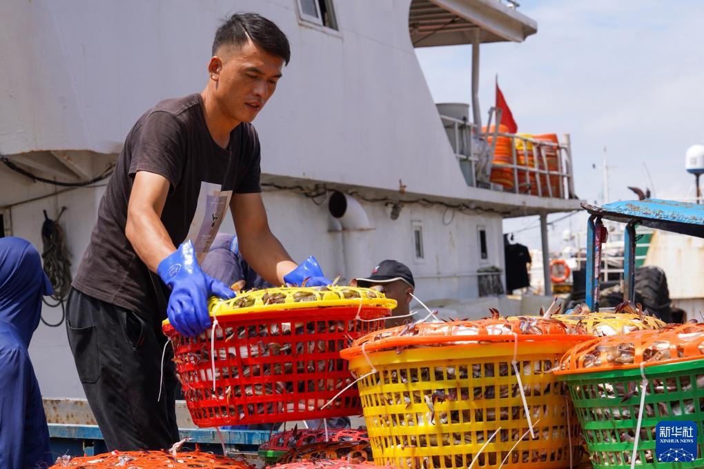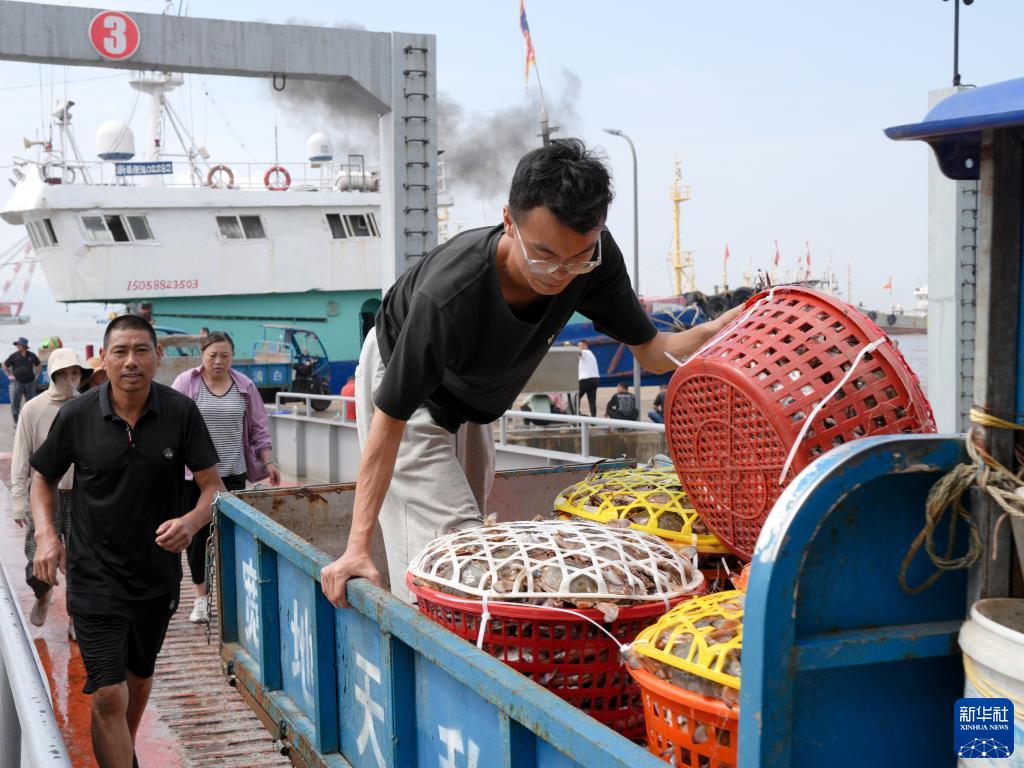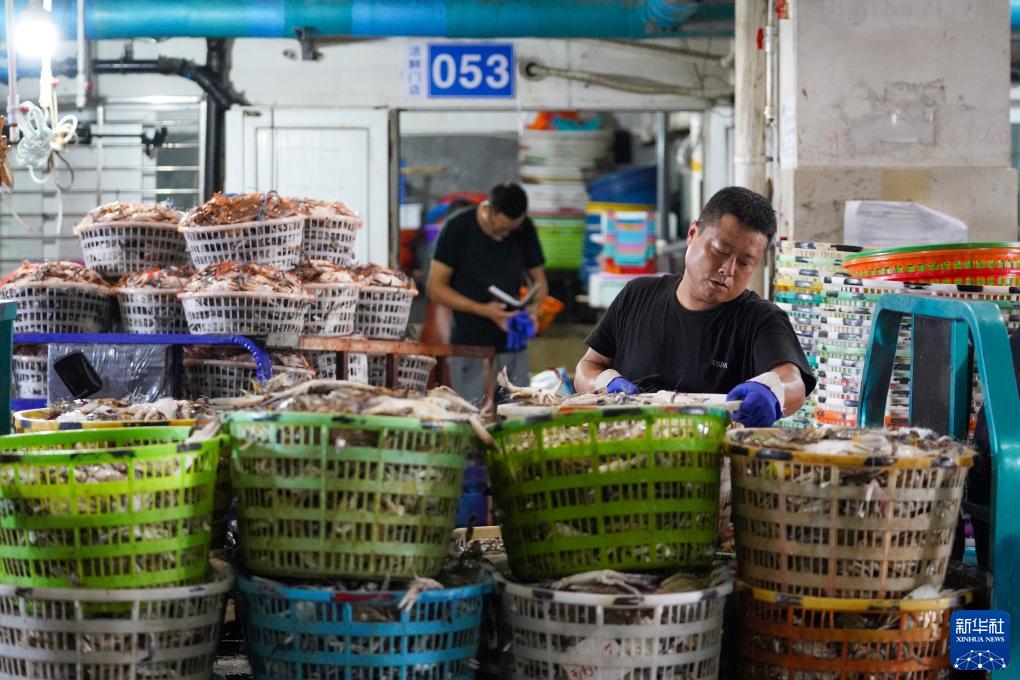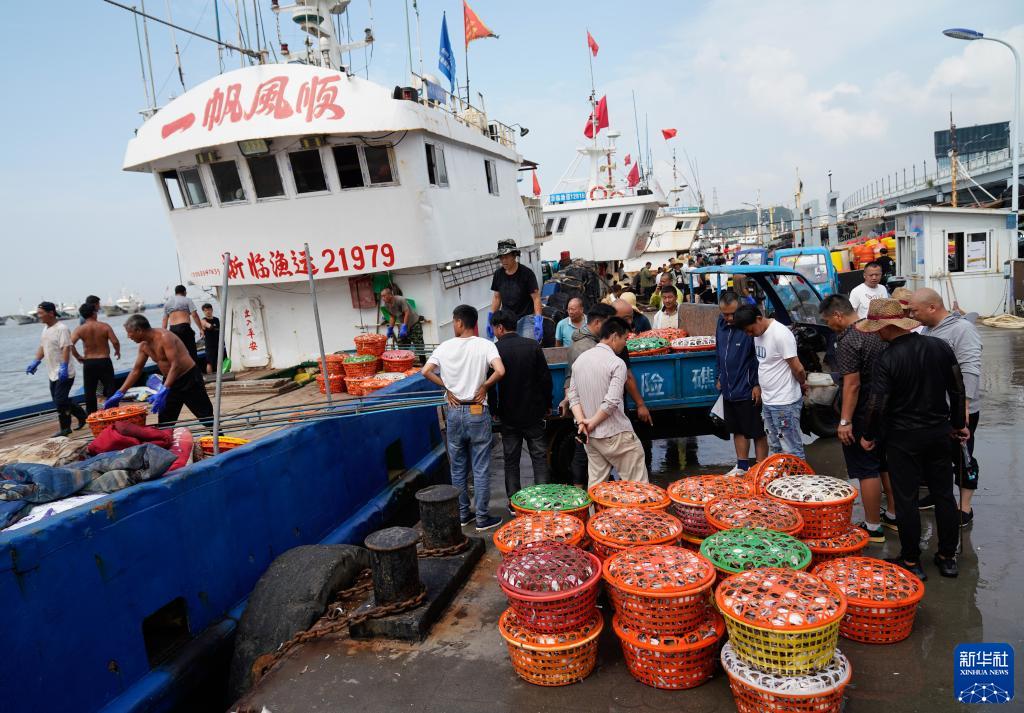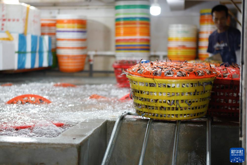 在浙江省舟山市,到港渔运船不时靠泊舟山国际水产城码头,带来一筐筐新鲜梭子蟹。从出舱、转运、分拣,再到打包、发货,无数人为了梭子蟹而忙碌,舟山国际水产城新鲜水产交易火热。
