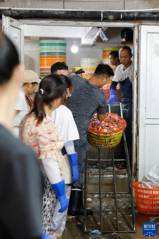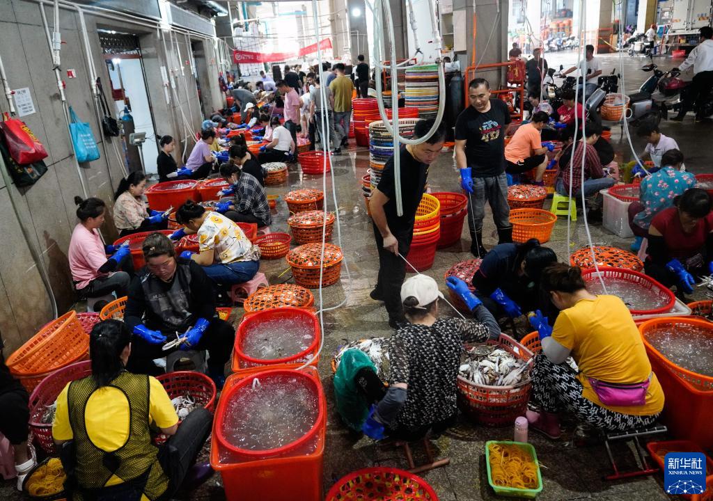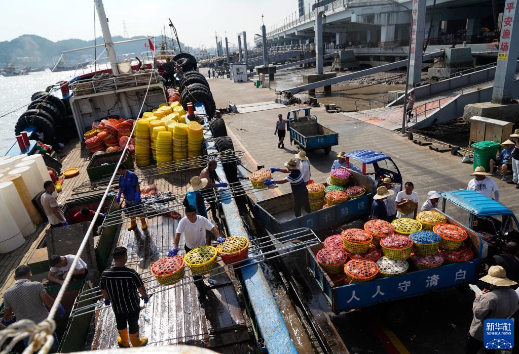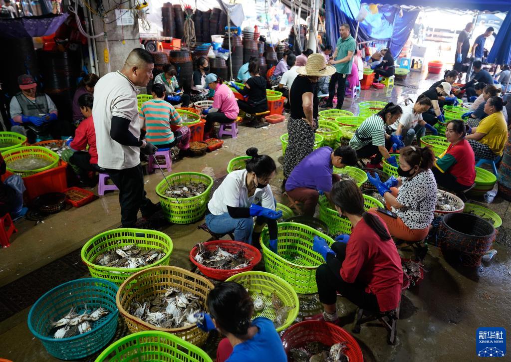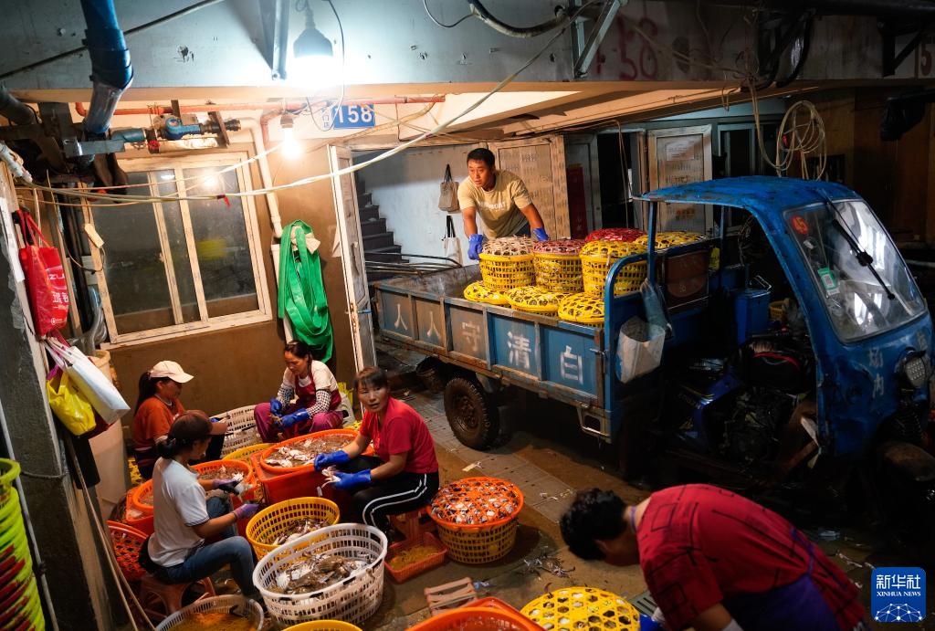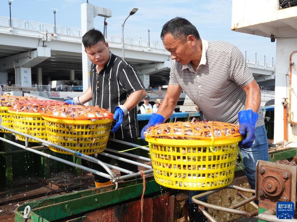 在浙江省舟山市,到港渔运船不时靠泊舟山国际水产城码头,带来一筐筐新鲜梭子蟹。从出舱、转运、分拣,再到打包、发货,无数人为了梭子蟹而忙碌,舟山国际水产城新鲜水产交易火热。