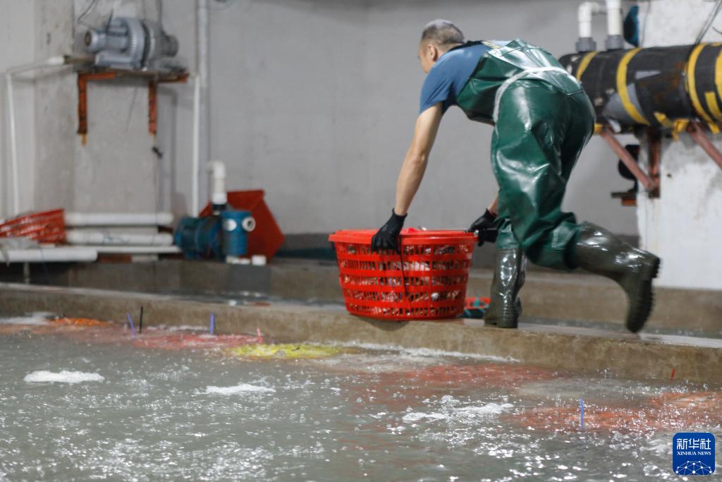 8月16日,在浙江省舟山市普陀区舟山国际水产城,工作人员将梭子蟹放在充氧水桶里。新华社记者 刘梦琪 摄