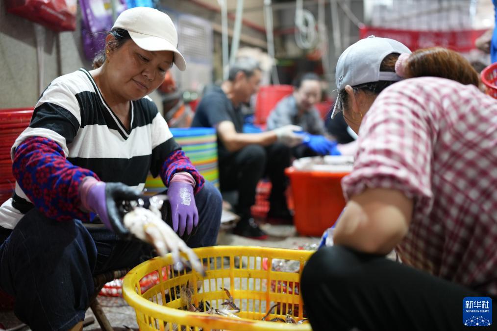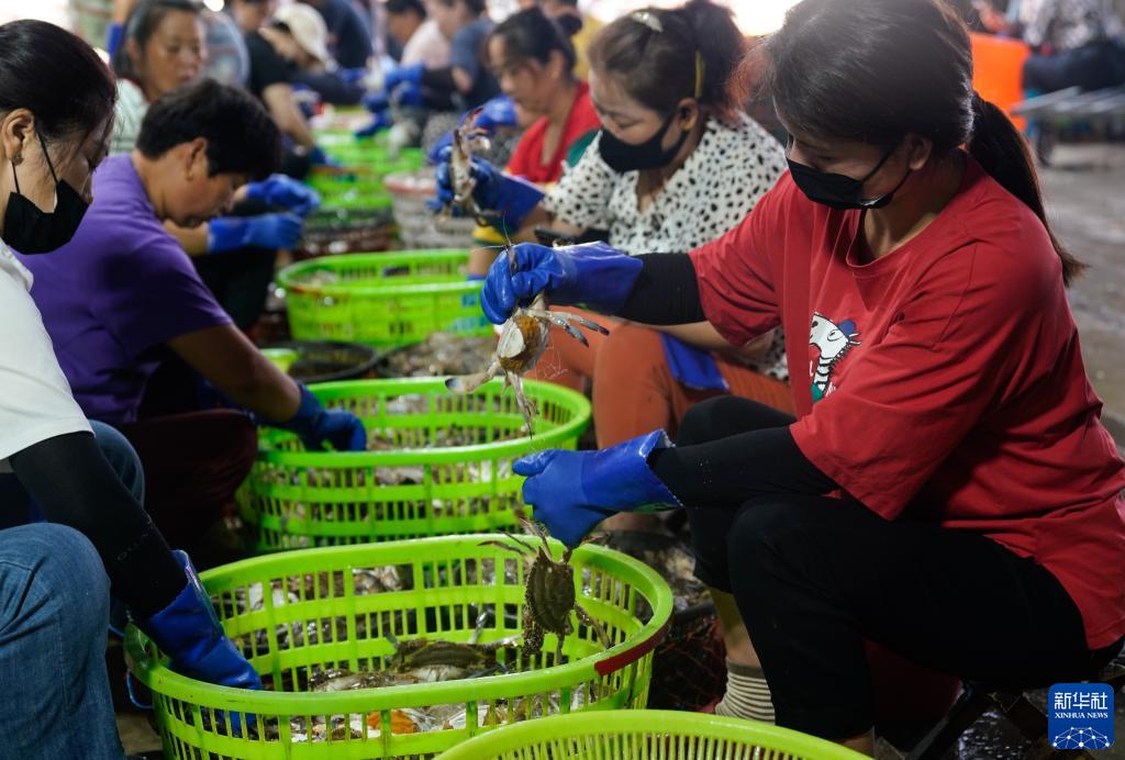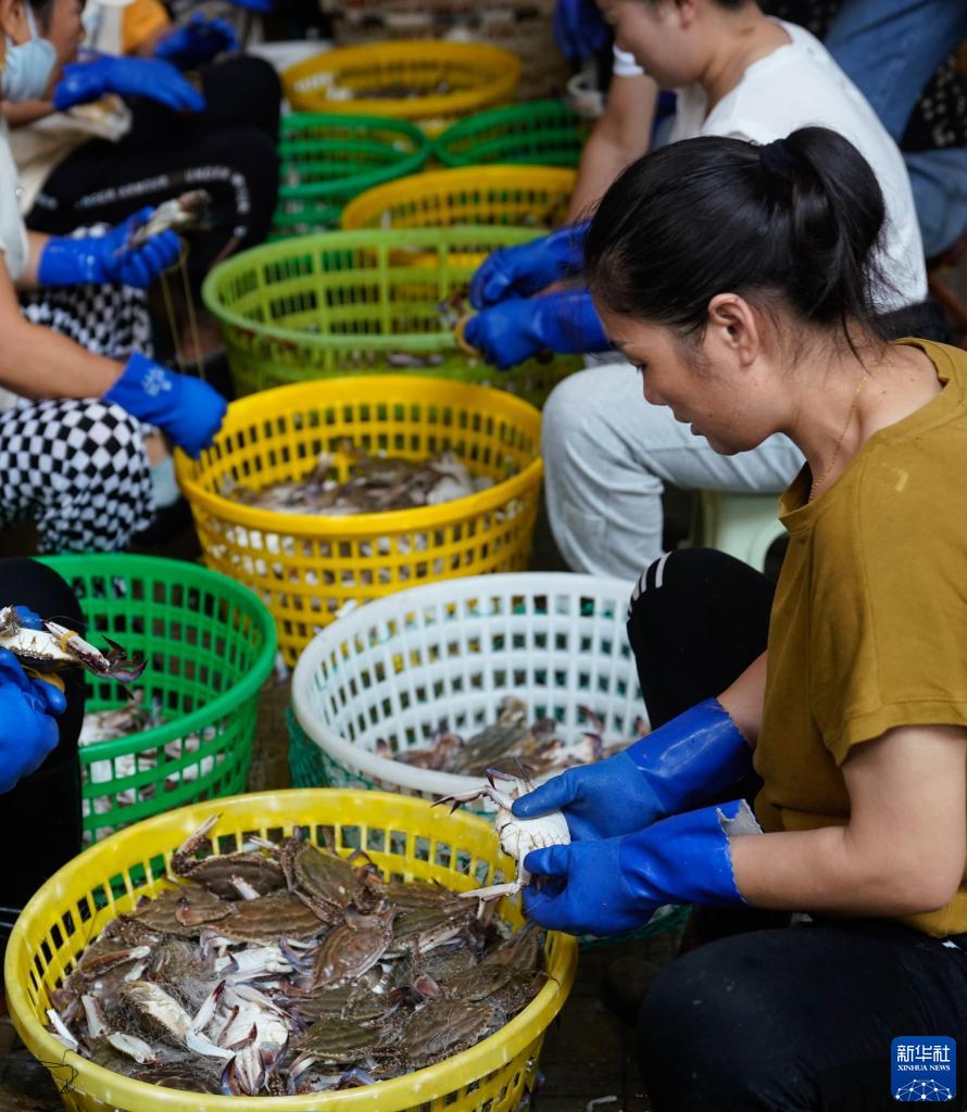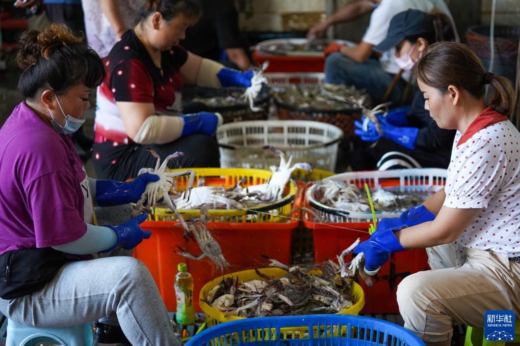 8月16日,在浙江省舟山市普陀区舟山国际水产城,工作人员绑扎、分拣梭子蟹。新华社记者 翁忻旸 摄