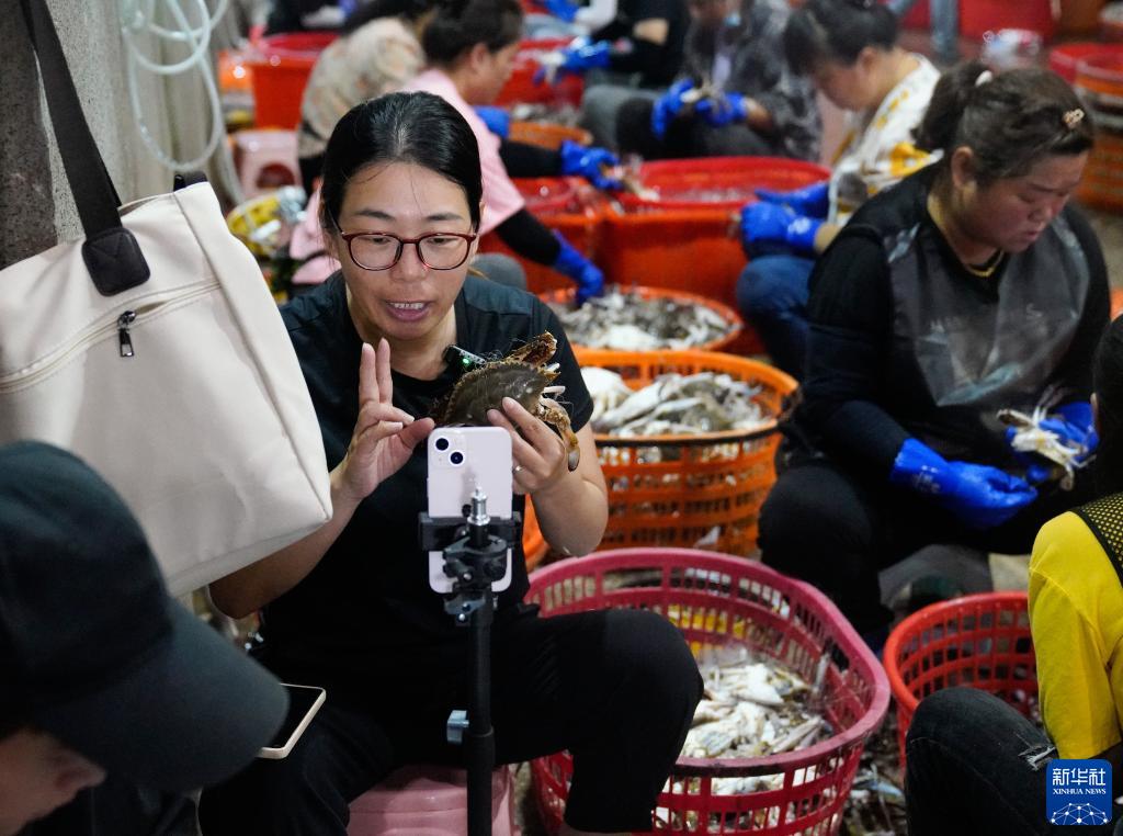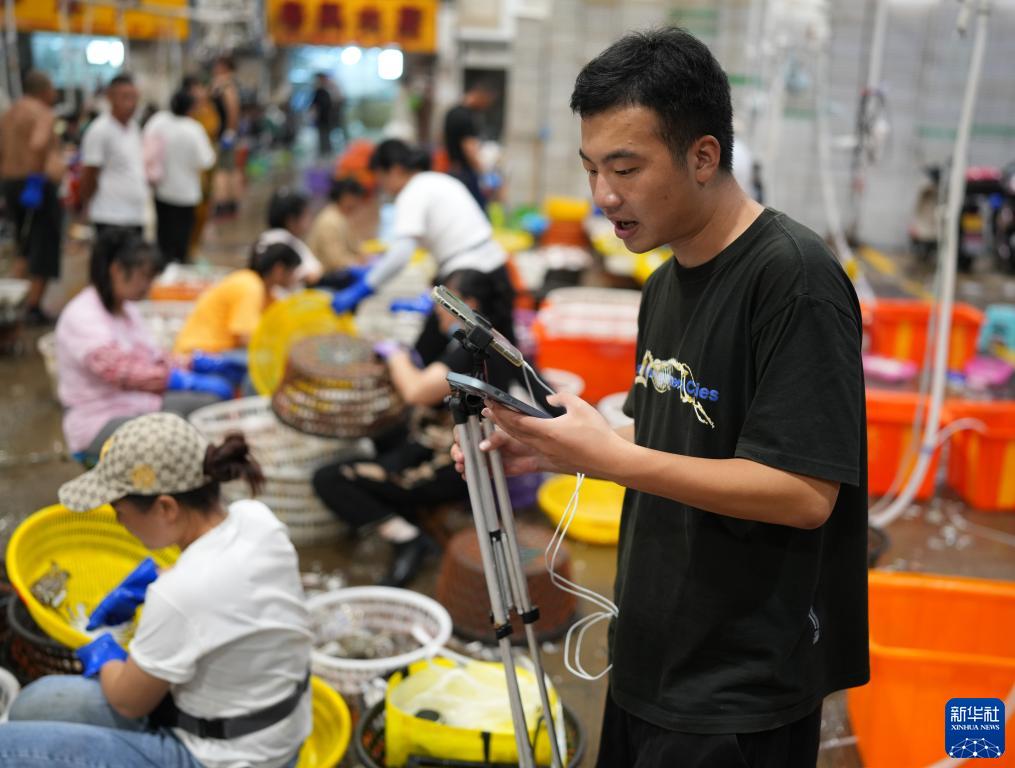 8月17日,在浙江省舟山市普陀区舟山国际水产城商户分拣现场,一名水产电商直播推介梭子蟹。新华社记者 韩传号 摄