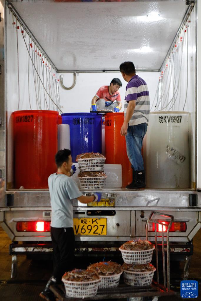 8月20日,在浙江省舟山市普陀区舟山国际水产城,工人将分拣好的梭子蟹装车。新华社发(邹训永 摄)