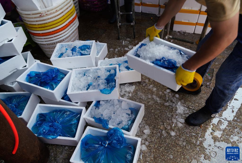 舟山国际水产城商户为保持梭子蟹鲜活度,招募来自安徽、河南等地的务工人员,他们争分夺秒扎蟹、加冰、装箱,交物流车辆发往江浙沪等地。