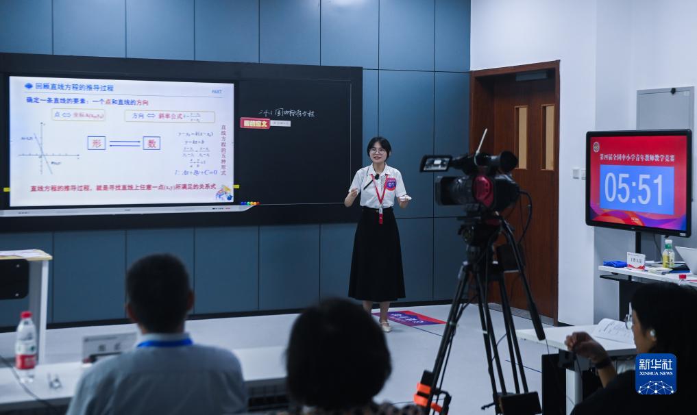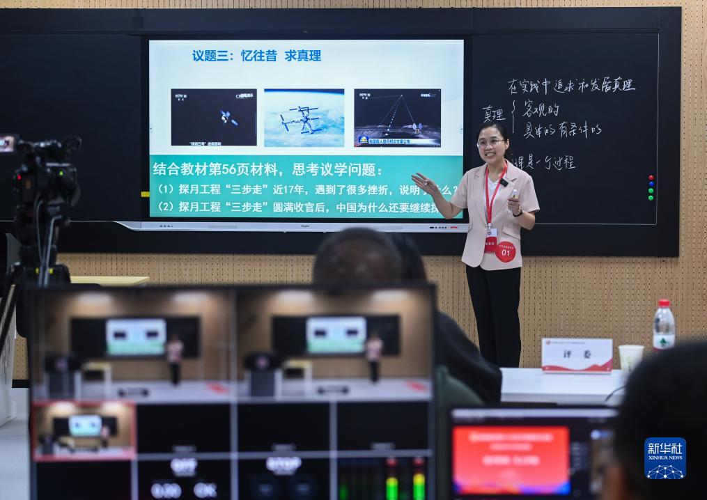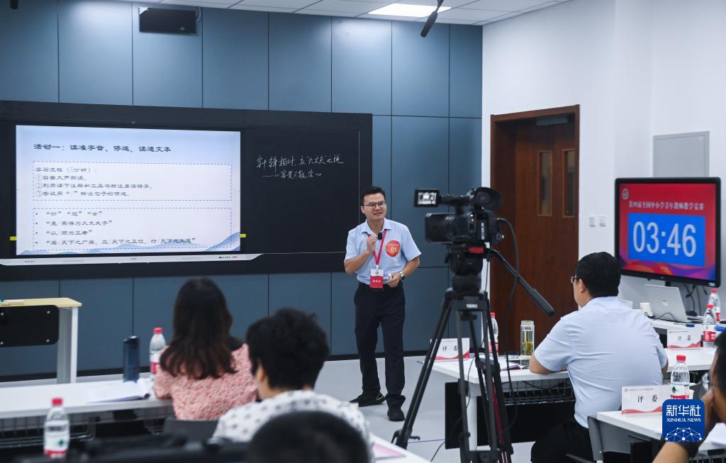 8月22日,第四届全国中小学青年教师教学竞赛决赛,中学思想政治组的一名教师在进行教学展示。