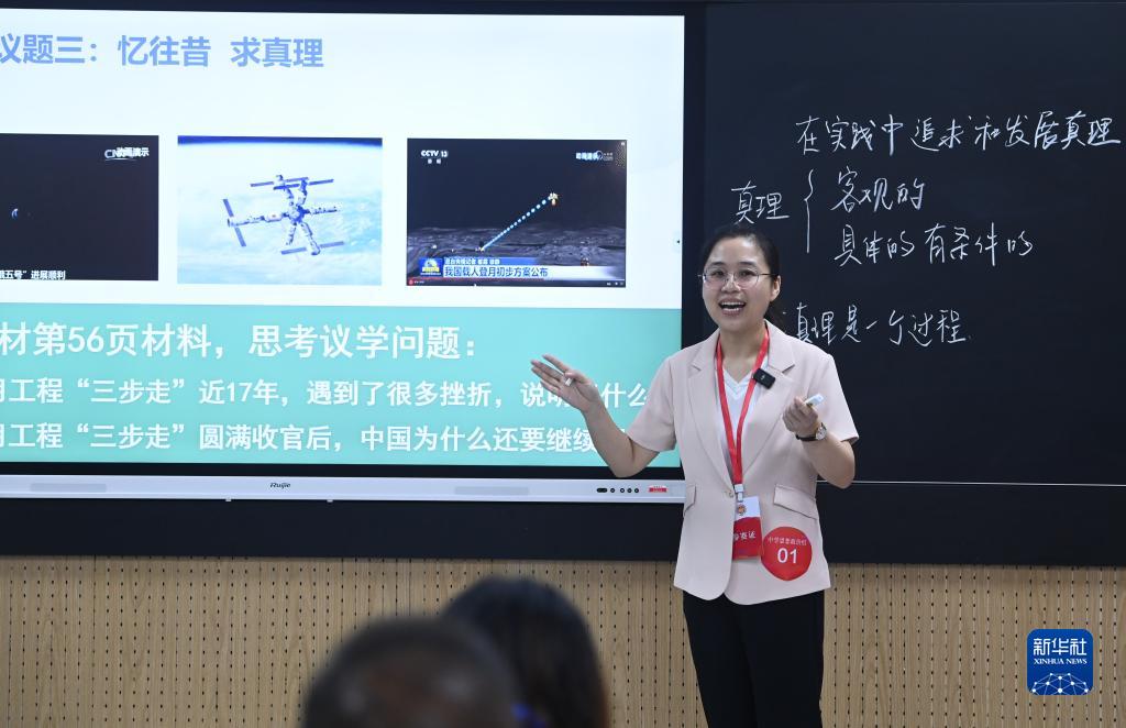 8月22日,中学思想政治组的一名教师在进行教学展示。