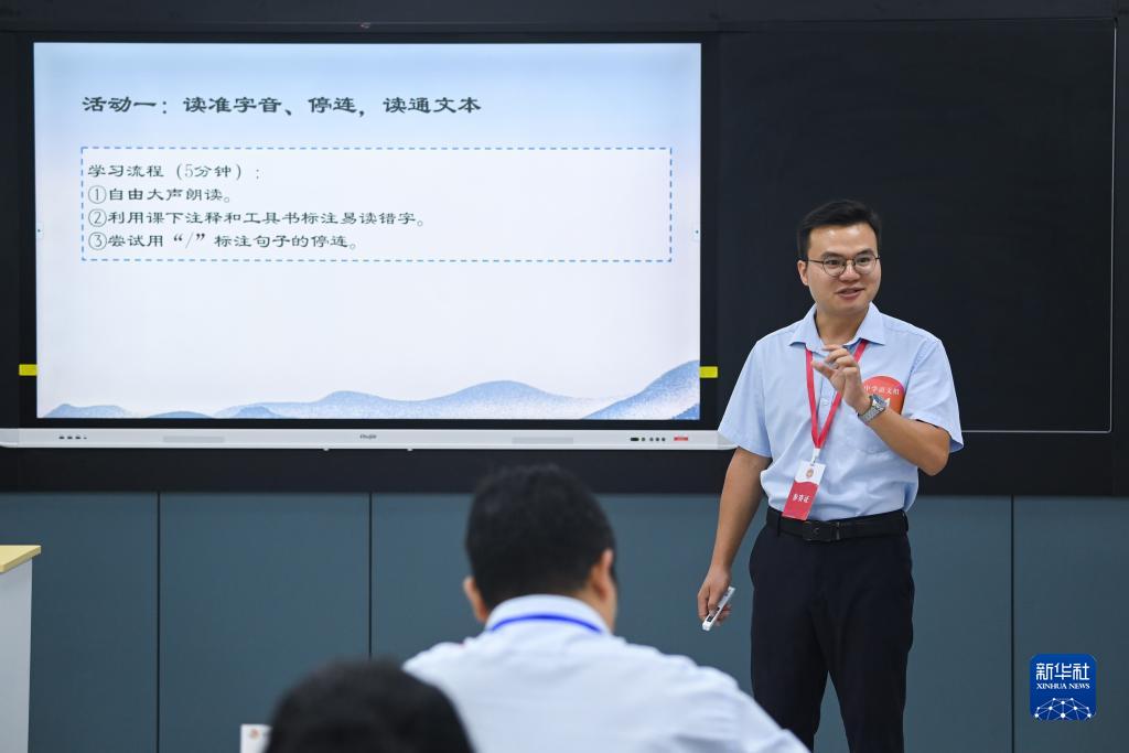 8月22日,中学语文组的一名教师在进行教学展示。