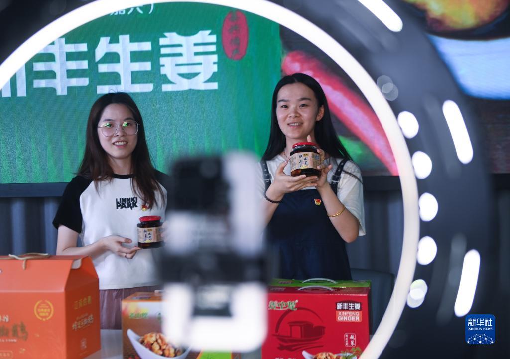8月22日,党员志愿者在嘉兴市南湖区电商产业园的共富工坊直播间进行生姜助农直播销售。