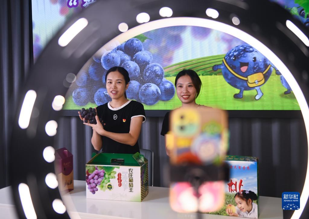 8月22日,党员志愿者在嘉兴市南湖区电商产业园的共富工坊直播间进行葡萄助农直播销售。