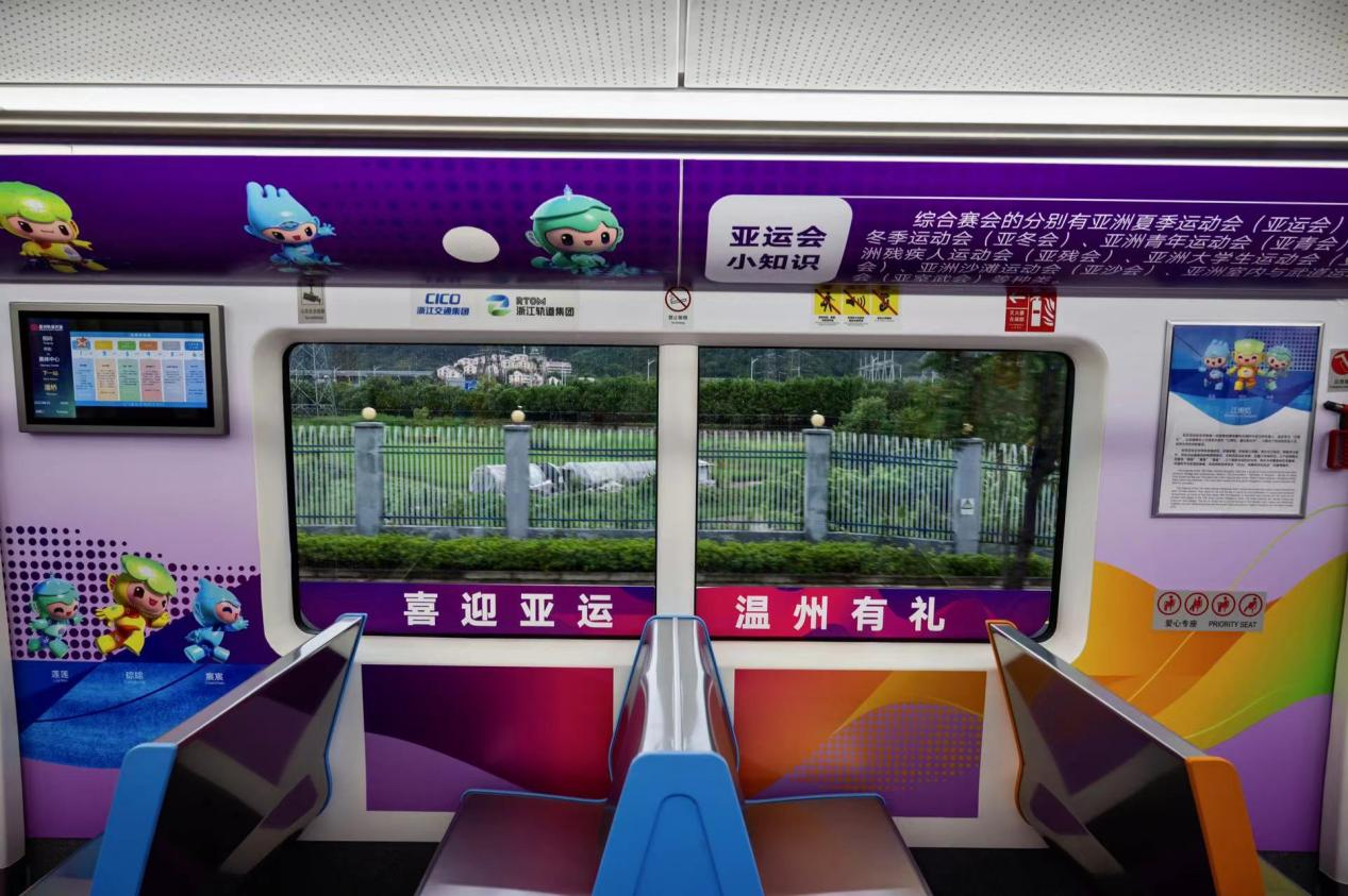 在保障服务亚运赛事轨道交通出行中,浙江交通集团在温州S1线投入了4辆主题列车,列车车身以本届亚运会主形象色“虹韵紫”为主色调,同时在车内玻璃隔断、窗户、车门等位置融入了赛事标语、吉祥物等亚运元素。