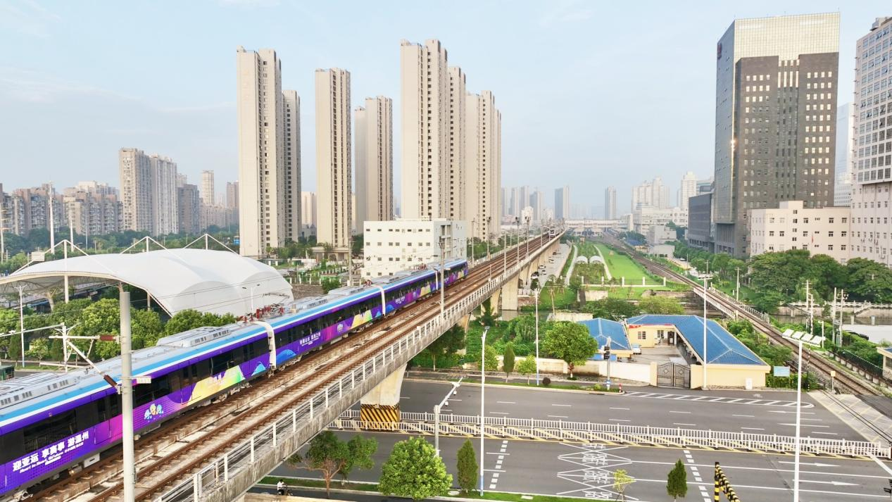 温州S1线亚运主题列车行驶在城市。浙江交通集团供图