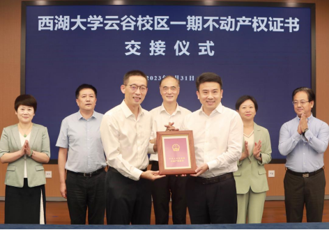8月31日,浙江省杭州市西湖区——西湖大学深化区校合作联席会议召开,西湖区向西湖大学移交云谷校区一期不动产权证书,助推双方深化合作,进一步打通科创研发到成果转化的“最初一公里”,培育更多科技新秀、产业未来。