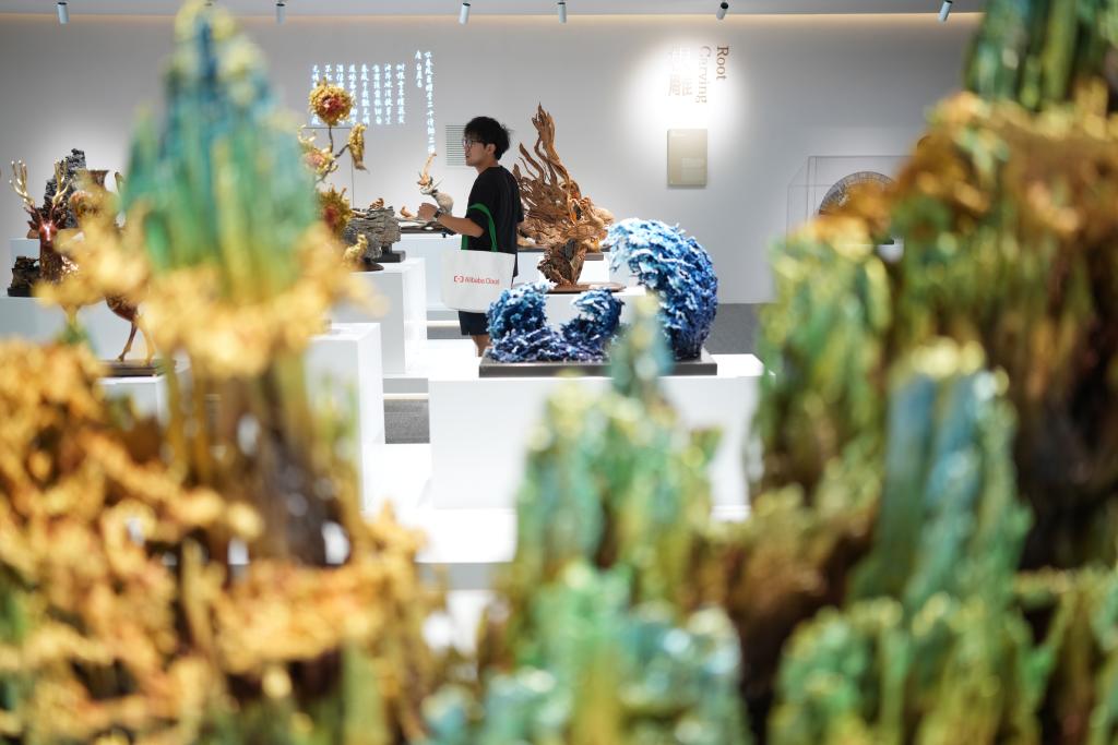9月12日,媒体记者参观亚运村内展示的铜雕、根雕作品。新华社记者翁忻旸 摄