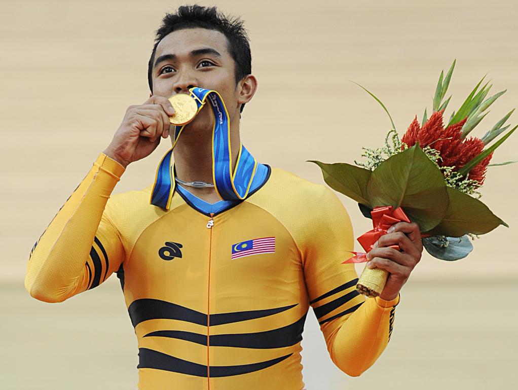 2010年11月17日,马来西亚选手阿齐兹·哈斯尼·阿旺获得广州亚运会场地自行车男子凯林赛金牌。新华社记者 李尕 摄