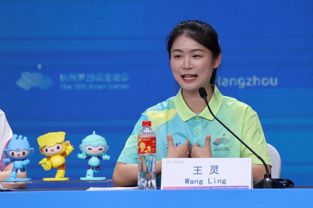 10月3日,杭州奥体中心体育场志愿者王灵在发布会上介绍有关情况。新华社记者 王楷焱 摄