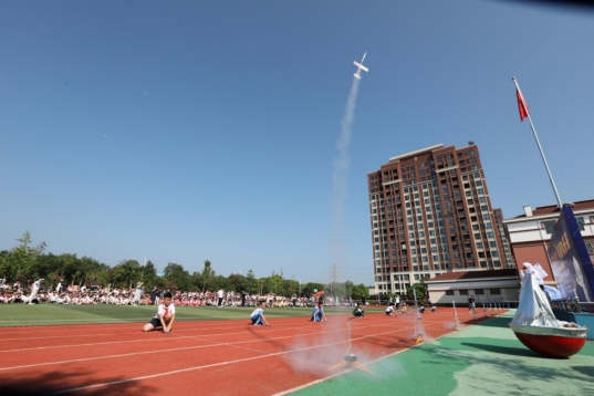 越城区科技协会进校园开展科技实验《火箭上天》。