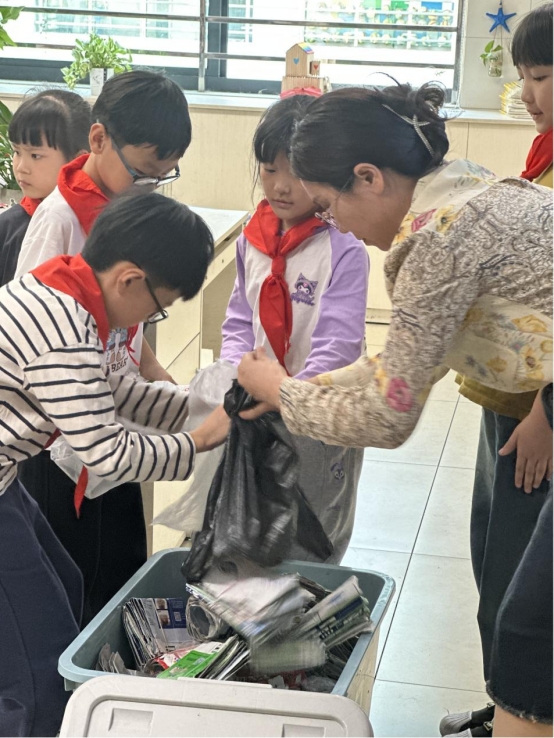 每周二,是学校的集“盒”日。同学们都会将家中收集并整理好的牛奶盒带到学校,进行班级集“盒”回收。下午大课间,进行校级统一回收,由校级牛奶盒回收管理员、街道垃圾分类督导员一起负责收集、登记和数据统计、反馈。同时,按每收集3个牛奶盒记1分的方法颁发积分二维码,学生们在班级电子班牌上扫码记入自己的“拉风银行”绿色账户。汇总的牛奶盒,由森林造纸专业人员过来回收,实现资源再利用。