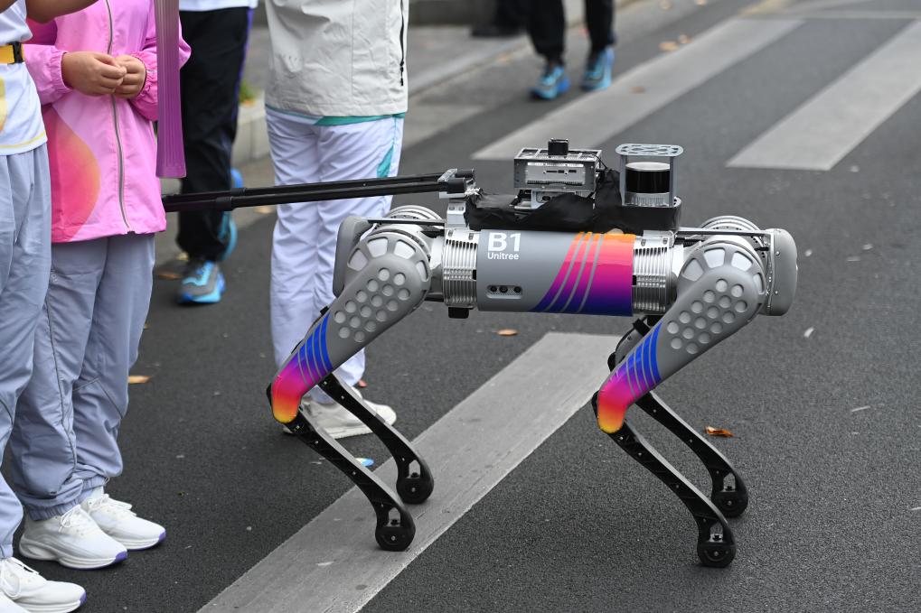 10月19日,火炬手蔡琼卉在智能导盲犬的引导下进行火炬传递。这是智能导盲犬首次在大型赛事火炬传递中亮相,它以四足智能机器人视觉识别能力引导视障残疾人行走。新华社记者黄宗治摄