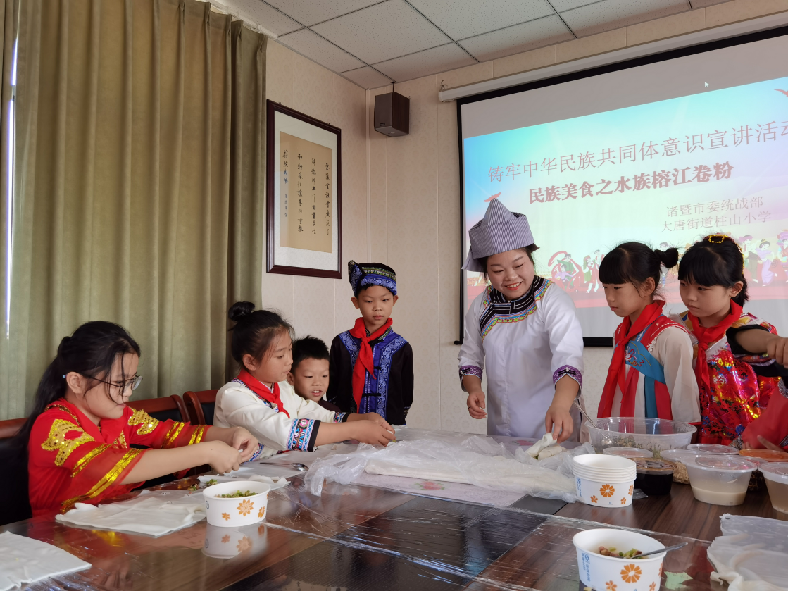 20多个学生剥粉盘、包粉片,跟着水族同学一起做一道软糯爽口的贵州榕江卷粉;学校新落成的民族特色馆音乐室里,苗族老师用一首《恨嫁歌》让学生们领略到了西南民歌的魅力;在教学楼之间的空地上,孩子们排队玩着壮族的抛绣球游戏、汉族的投壶游戏……这就是浙江省诸暨市大唐街道柱山小学的教学日常。