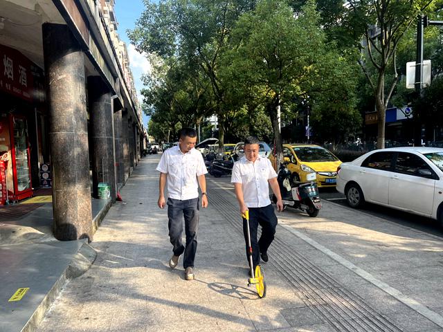 景宁县烟草专卖局专卖执法人员正在开展校园周边店铺现场测距勘察工作。鲍怡勇摄