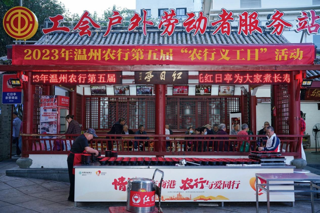 在浙江省温州市区红日亭“大爱温州”慈善地标点,来自农行温州分行的志愿者在现场忙碌着。早上6点,红日亭爱心早餐摊位前就排起了长队,从准备食材、分发汤面、桌椅摆放、秩序维护再到回收碗筷……300多碗鸡蛋面不到一个小时就分发完毕。