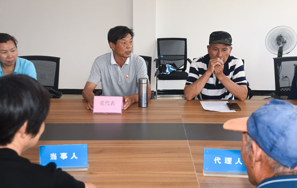 在浙江省诸暨市东白湖镇娄东村新时代文明实践站,网格长召集村里矛盾双方当事人以及党员代表、乡贤代表、人大代表等进行宅基地指标纠纷的现场调解(2023年7月26日摄)。新华社记者 徐昱 摄