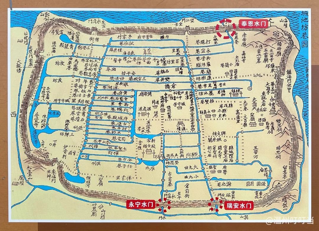 直通瓯江的奉恩水门同样造福过温州人。明弘治《温州府志》记载:“遇于旱,即开此闸,引潮入城以益内水,涝则尽开放之,为城中蓄泄之要。”在清代和民国的老地图中,也有水门位置标注。