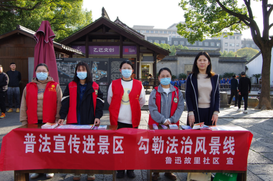 塔山司法所携手塔山街道鲁迅故里社区开展“普法宣传进景区 勾勒法治风景线”活动。司法所工作人及社区志愿者向外地游客及周围群众普及宪法以及与生产生活相关的《民法典》中的法律法规知识,向学生和游客分发了鲁迅故里社区特有的代表景区人群的紫色书签,告知游客在旅游过程中碰到问题如何依法维护自身权益及相关警务、社区等热线信息。