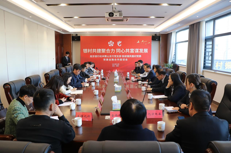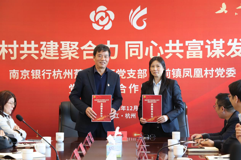 近日,南京银行杭州萧山支行党支部与杭州市萧山区衙前镇凤凰村党委开展“银村共建聚合力,同心共富谋发展”党建金融合作座谈会。会上,双方签署金融服务协议,以整村授信为抓手,加大金融支持力度,解决当地企业资金需求,助力乡村振兴,进一步深化“党建+金融”实践。