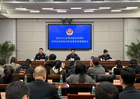 温州市公安局侦破钟某团伙利用信息网络寻衅滋事案案情通报会。温州市公安局供图