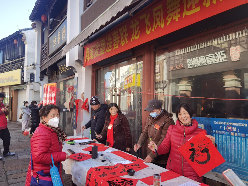 上联“诈骗手段万万千”,下联“捂紧钱袋不沾边”,横批“全民反诈”;上联“远离毒品千家喜”,下联“珍爱生命万户欢”,横批“天下无毒”……活动邀请湖州老年书画研究会书法老师挥毫泼墨,将饱含美好祝福的平安春联送给过路群众。