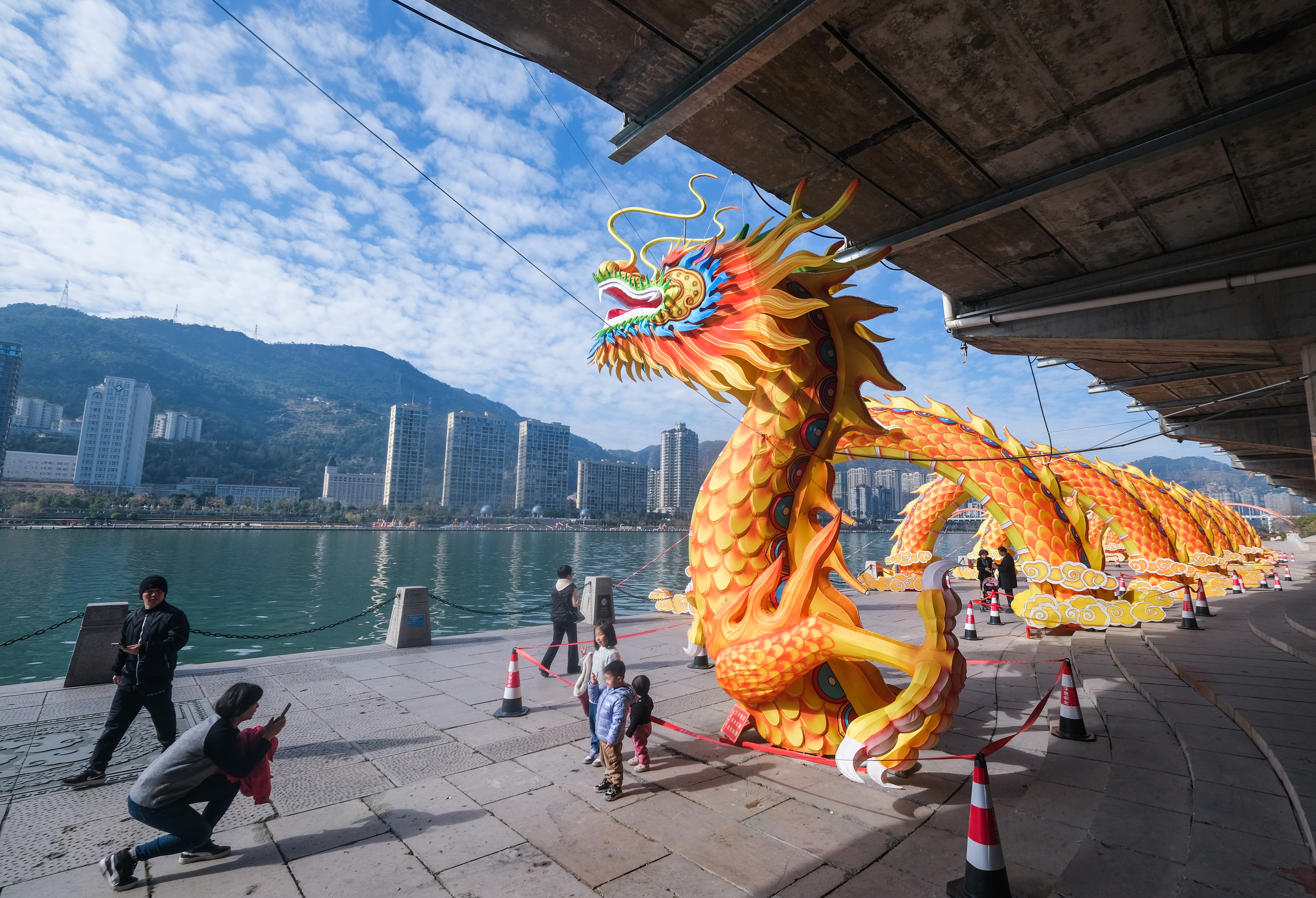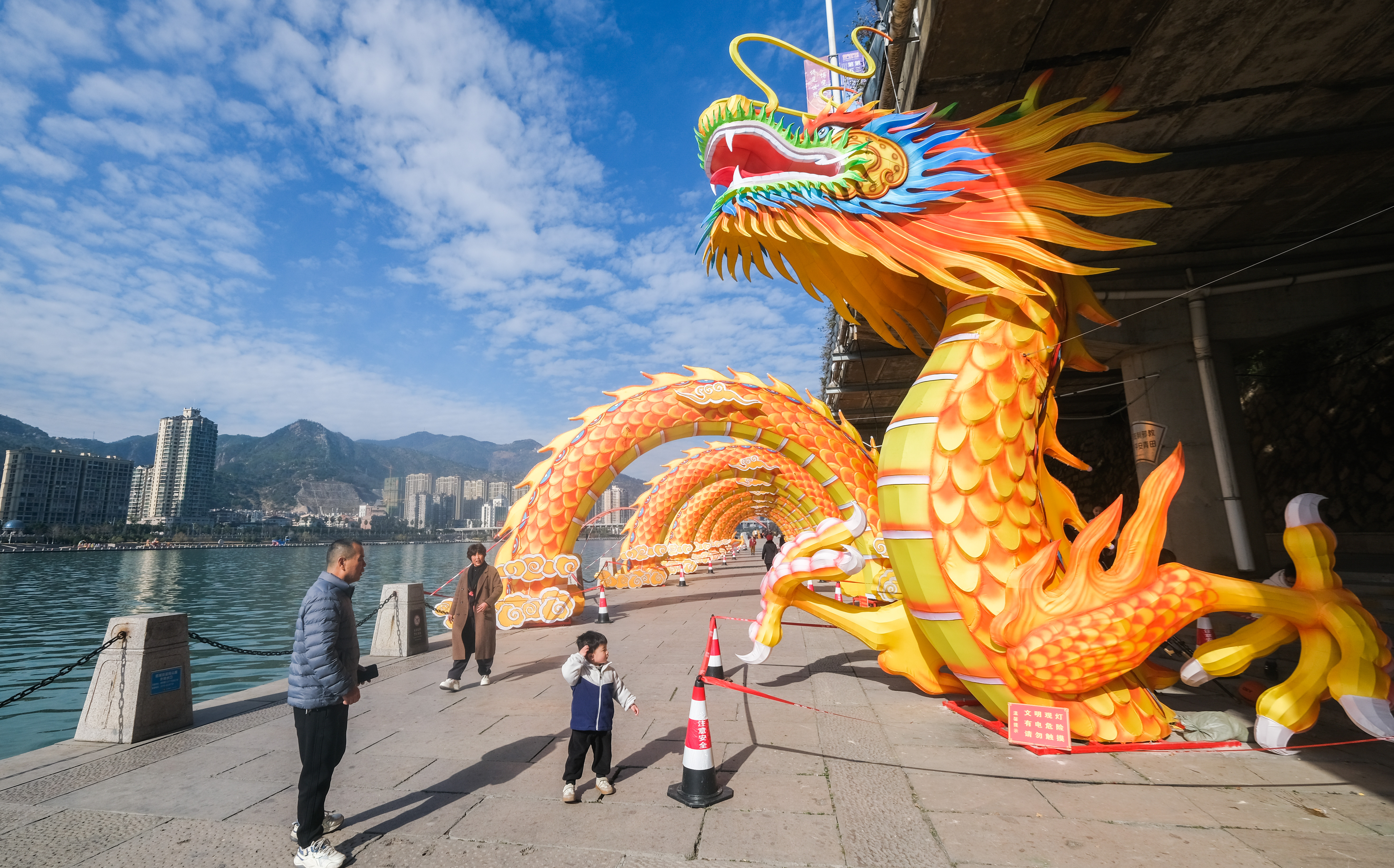 1月14日,小朋友在青田县瓯江畔的神龙彩灯前拍照留影。新华社记者 徐昱 摄