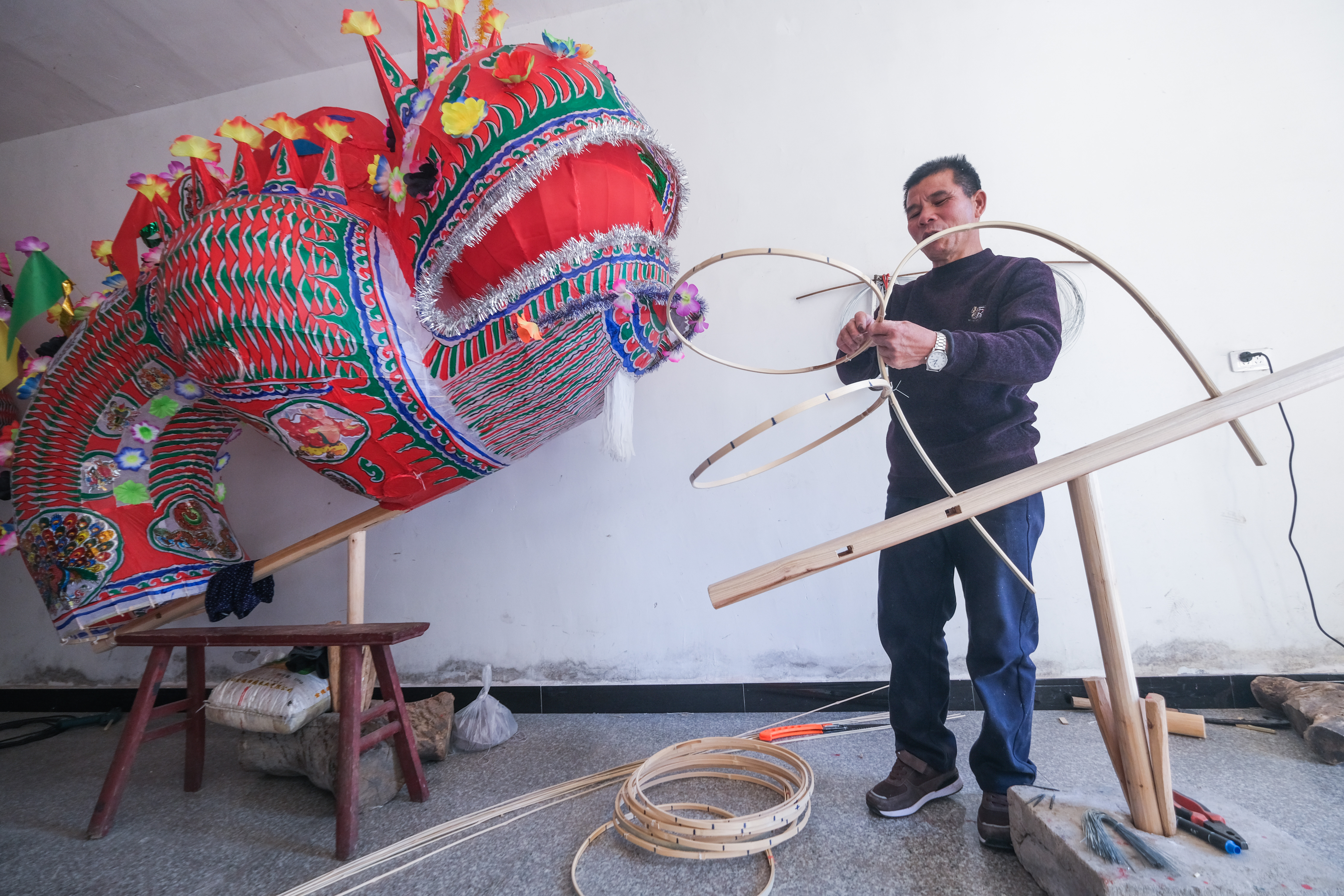 1月13日,青田县温溪镇的陈建南正在摆放刚做好的龙灯。青田唱龙灯习俗是丽水市非物质文化遗产代表性保护项目,正月初二开始,龙灯配上唱龙灯艺人到各村进行表演,祈求风调雨顺、平安有福。新华社记者 徐昱 摄