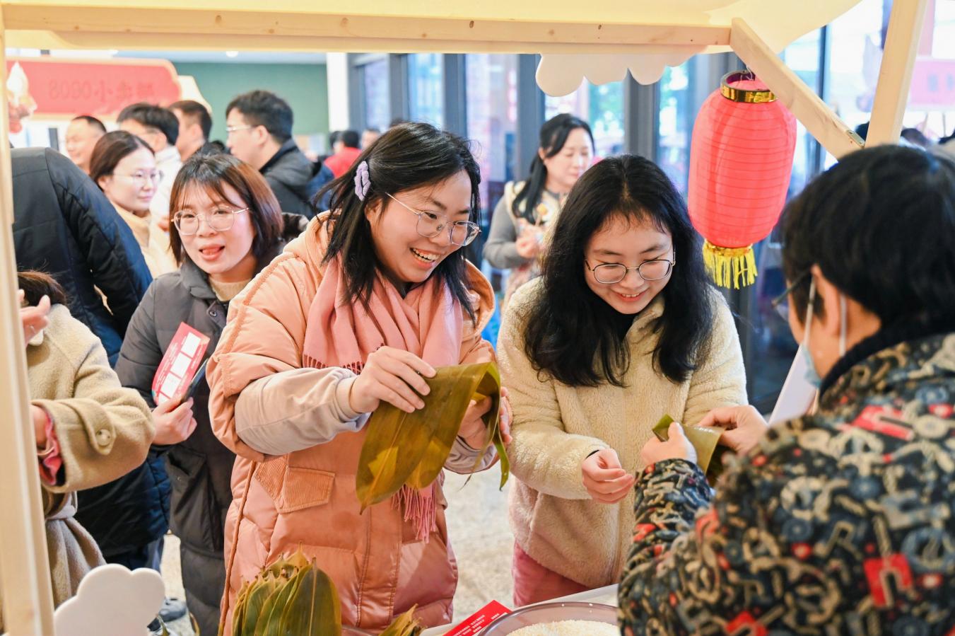 活动现场设置了“富盛味道集”“小吃年俗集”“美食制作体验集”等30余个展位。“前两天就听说富盛镇上旺村有活动,趁周末特地从城里过来逛逛,买点年货过年用,现场还有爱心集市,我还拿到了免费对联、尝到了抹茶口味的年糕胖和文创黄酒,这样的活动我们很喜欢,很有年味。”市民张先生说。
