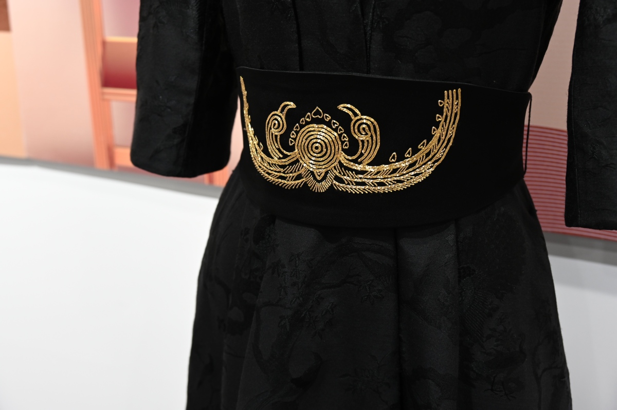不止阳明文化,余姚的另一张文化“金名片”——河姆渡文化,也被设计师“搬”上了时尚T台。现场一件有着明显河姆渡文化元素的黑色礼服,也吸引了不少参观者驻足欣赏。“在这件纯黑礼服的腰带上,我们用金色线条绣出了河姆渡文化的标志性图案——双鸟朝阳纹,低调内敛地将传统文化的魅力凸显出来。”康珊娟说。