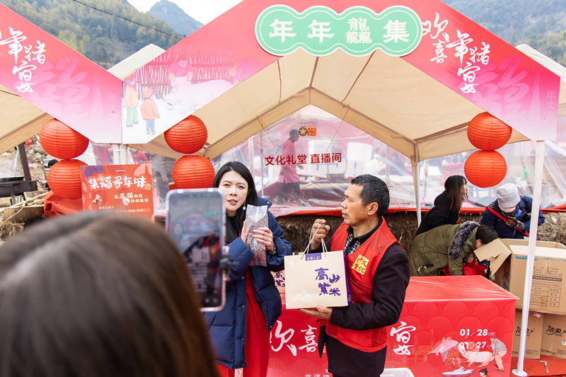 “我们五尖山村位于海拔500多米的山上,因为有杀猪岩尖、锅灶岩尖、饭蒸岩尖、龙腾尖、吊船岩尖五个山尖而得名……”活动现场,文化礼堂管理员李金彪与现场观众互动,讲解五尖山村名由来,带着线上线下观众一起体验杀年猪、捣麻糍、做豆腐、挖冬笋、烹菜肴等年味习俗,并将五尖山村自产自销的高山紫米、绿豆面、烤糖等优质农产品介绍给镜头前的观众朋友。