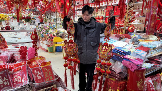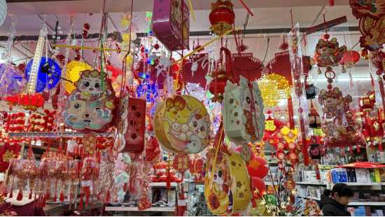 在春节饰品市场,各种龙图案灯笼、款式各异的龙布偶、喜气洋洋的龙挂件等装饰品争相展示,红彤彤的一片将过年的氛围渲染得更加浓厚。在余姚市世南东路的南门副食品批发市场,一片喜庆景象夺人眼球。各个摊位上,“龙元素”的产品纷纷抢占“C位”。市民应先生在和家人选购家中春节饰品时表示,每年他都会和父母在年前购买新年饰品,今天已经挑中了两个带有“龙”图案的灯笼。