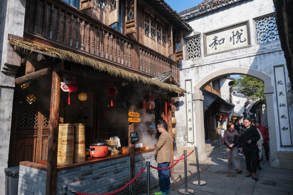 2月11日,游客在濮院时尚古镇品尝传统美食。新华社记者 徐昱 摄