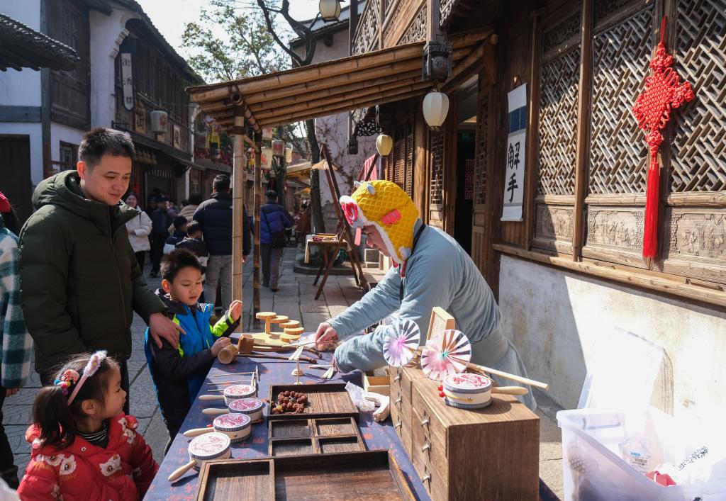 春节期间,位于浙江省嘉兴桐乡市濮院镇的濮院时尚古镇内张灯结彩、喜气洋洋,各种民俗展示、传统美食制作,吸引全国各地的游客来此感受江南水乡的特色年味。濮院时尚古镇以“历史街区再利用”的概念整治改建而成,拥有典型的江南水乡地貌特征,目前日接待游客两万人次。 新华社记者 徐昱 摄