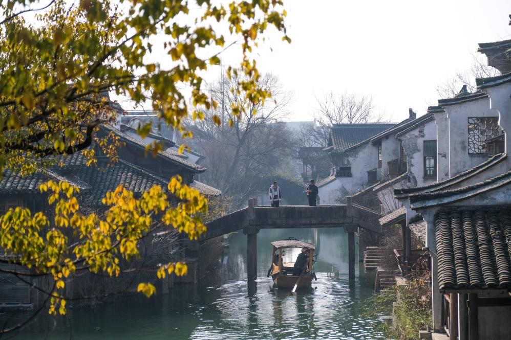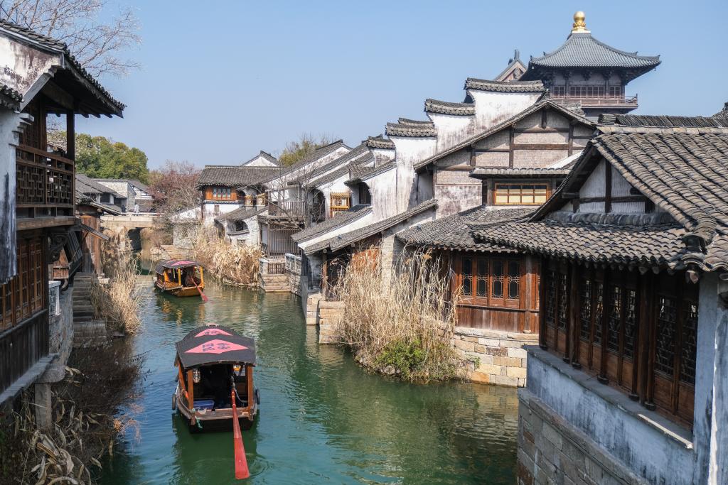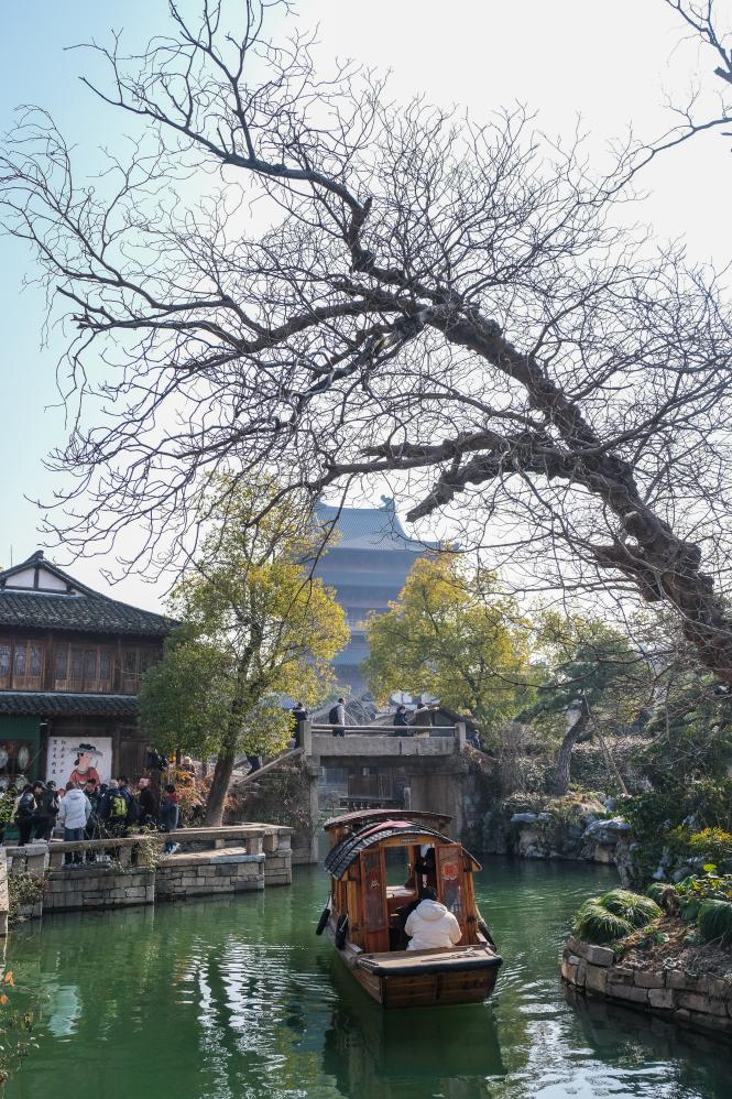 2月11日,游客在濮院时尚古镇乘船游览。