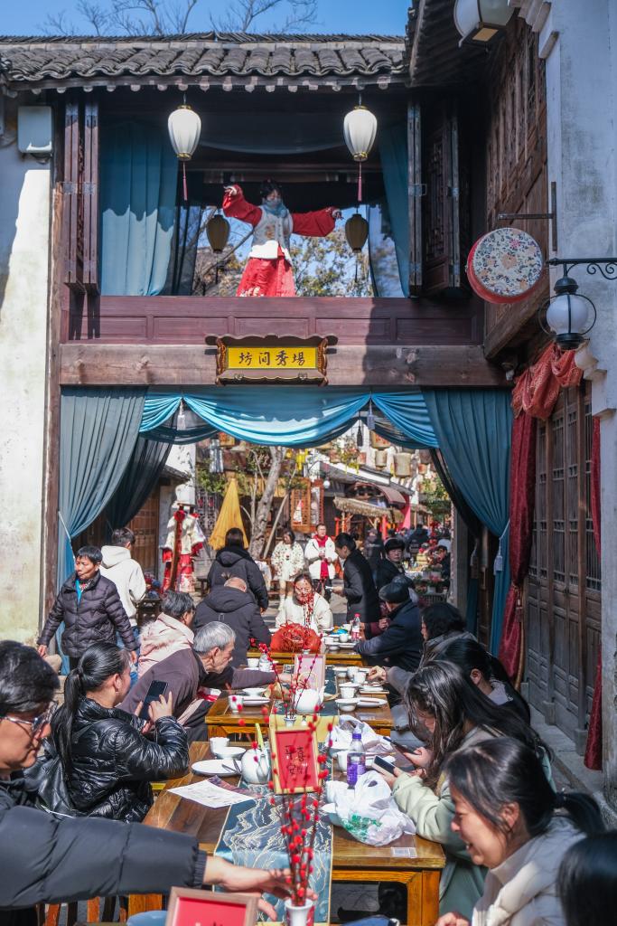 2月11日,游客在濮院时尚古镇品尝长街宴,感受传统年味。新华社记者 徐昱 摄